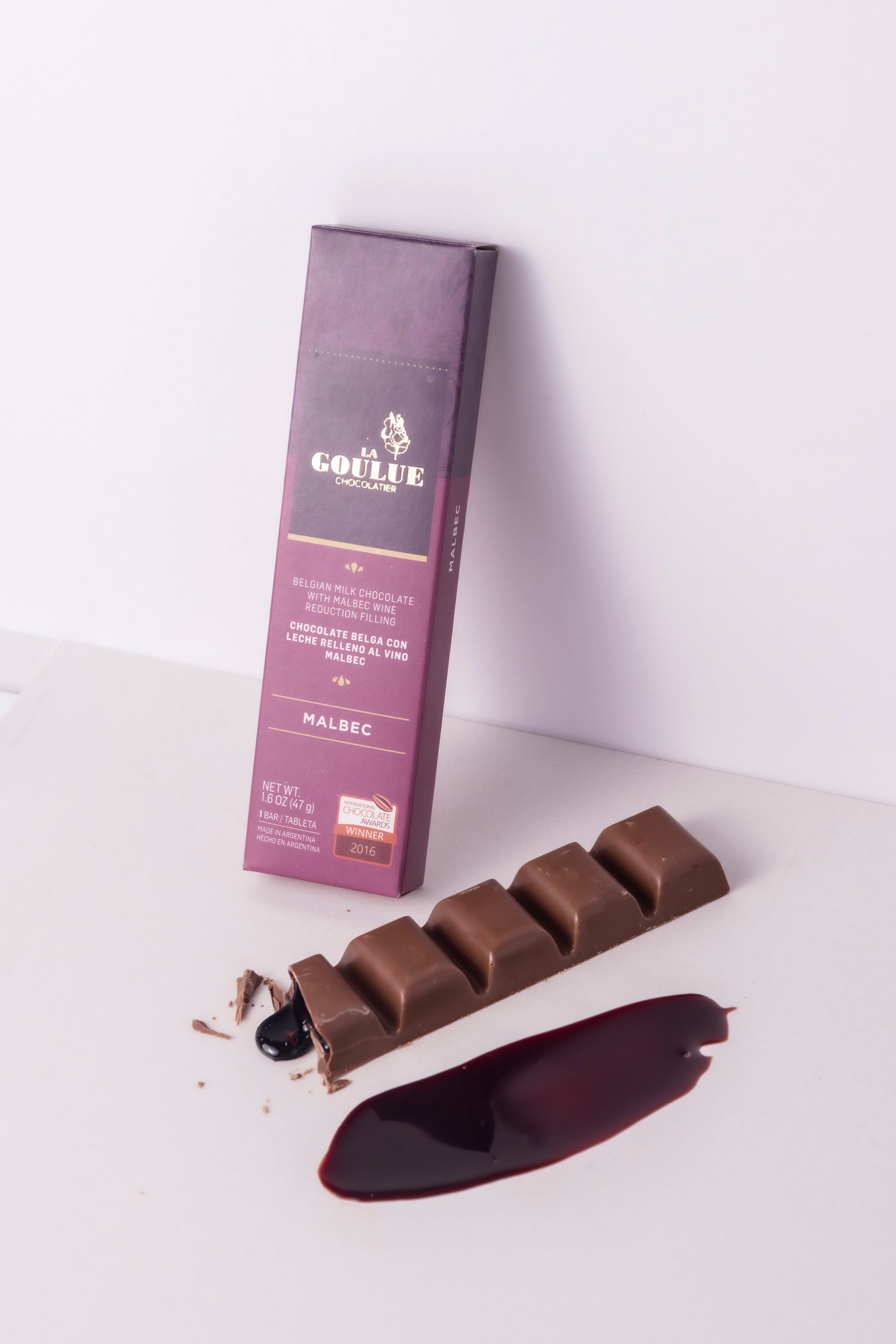 -Belgium Milk Chocolate (35% cocoa content) with Malbec wine reduction filling 1.6 OZ (47 g).