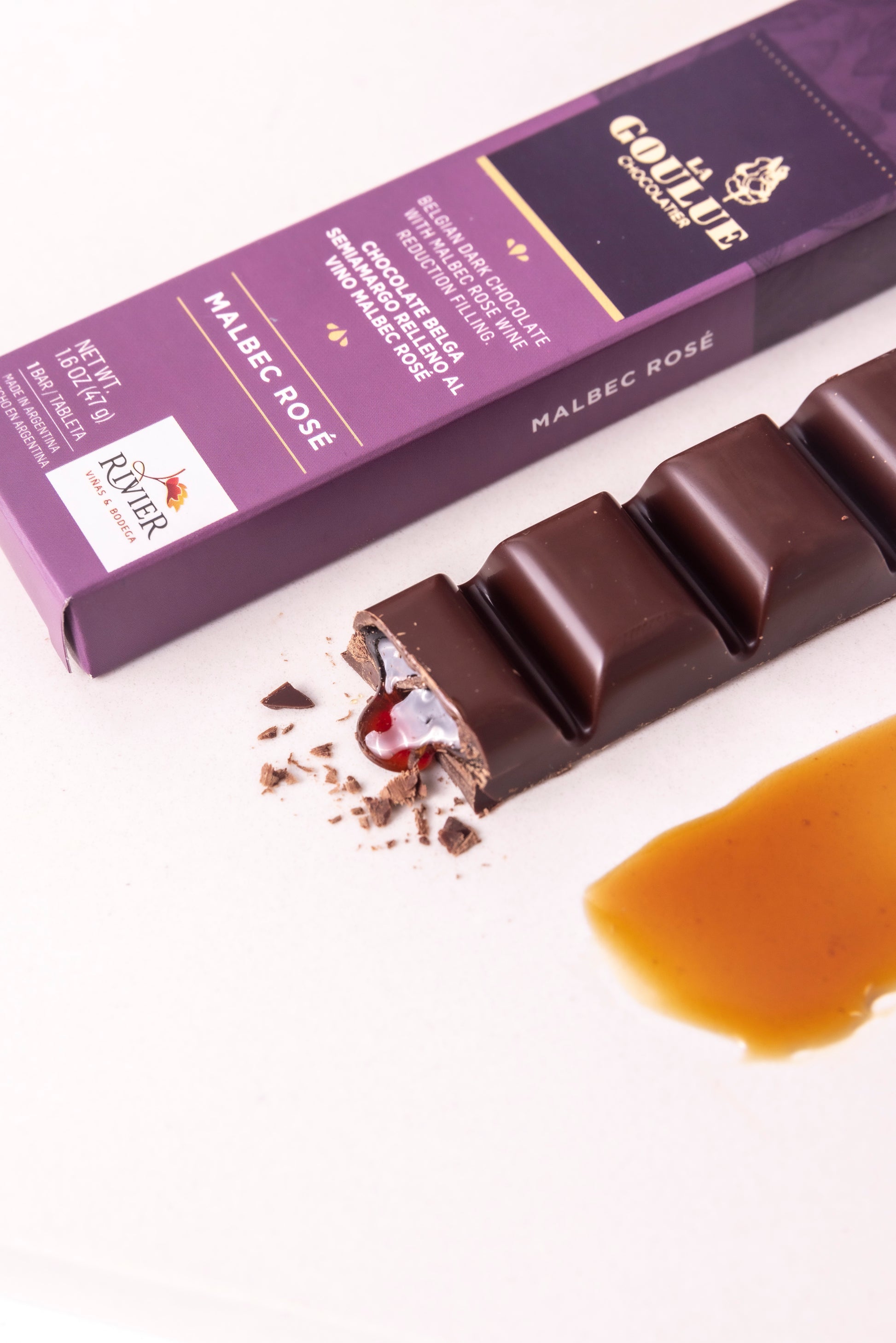 -Belgium Dark Chocolate (55% cocoa content) with Malbec Rose wine reduction filling 1.6 OZ (47 g).